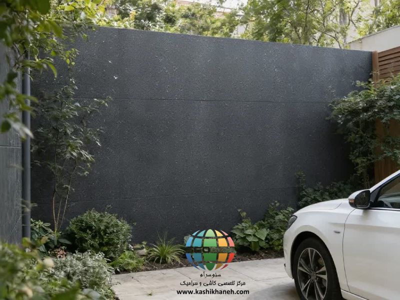همچنین دیور طوسی تیره مات کاشی پرسپولیس برای دیوارهای حائل، دور محوطه استخر و دیوارهای بلند حیاط، رنگ تیره آن باعث ایجاد یک پسزمینه دراماتیک می شود که به همراه المانهای روشن یا گیاهان سبز ،گزینه بسیار جذابی برای طراحی دیوار باغ و ویلا می باشد.