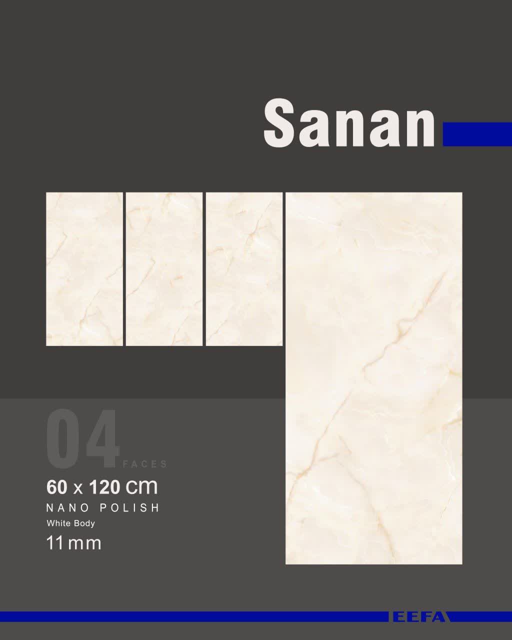 سرامیک پرسلان سانان کاشی ایفاسرام تولید شده در سایز ۱۲۰×۶۰ با لعاب نانوپولیش و ضخامت ۱۲ میلیمتر، یکی از چشمگیر ترین محصولات این کارخانه استاندارد و به روز می باشد.