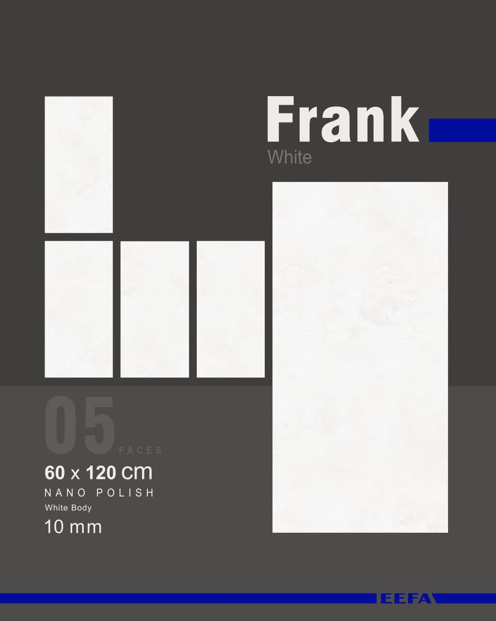 سرامیک پرسلان فرانک کاشی ایفاسرام تولید شده در سایز ۱۲۰×۶۰ با لعاب نانوپولیش و ضخامت ۱۲ میلیمتر، یکی از چشمگیر ترین محصولات این کارخانه استاندارد و به روز می باشد.