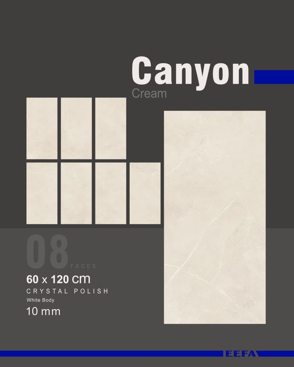 سرامیک پرسلان کنیون کاشی ایفاسرام تولید شده در سایز ۱۲۰×۶۰ با لعاب کریستال پولیش و ضخامت ۱۲ میلیمتر، یکی از چشمگیر ترین محصولات این کارخانه استاندارد و به روز می باشد.